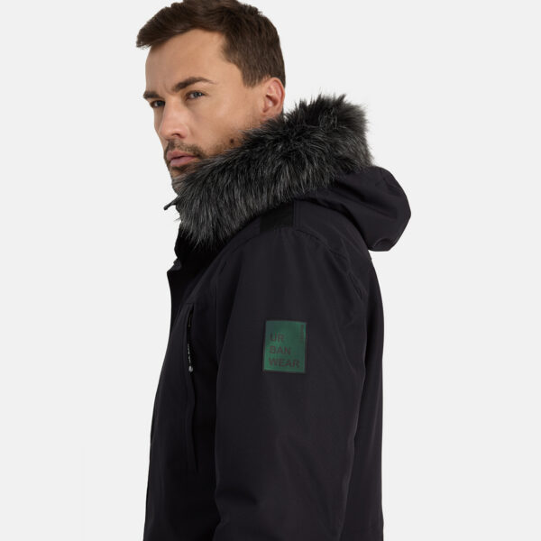 Men´s waterproof and windproof winter coat. Breathable outer fabric. Soft inner fabric. Faux sheepskin lining on the upper back and inside the hood. Adjustable hood. Ribbed cuffs at the sleeve ends. Adjustable sleeve ends. Two-way zipper covered with a press stud at the front. Front pockets with zippers covered by a flap with a magnetic closure. Elastic cord tunnel with stoppers at the waist. Waterproof taped seams. Removable faux fur trim on the hood. Reflective details on the outer fabric.