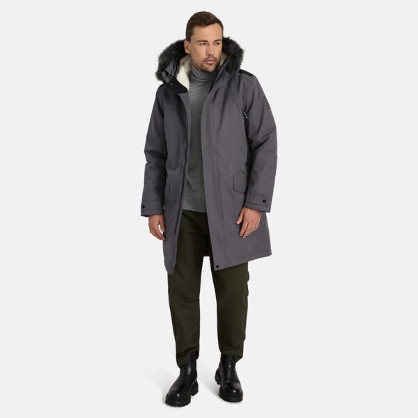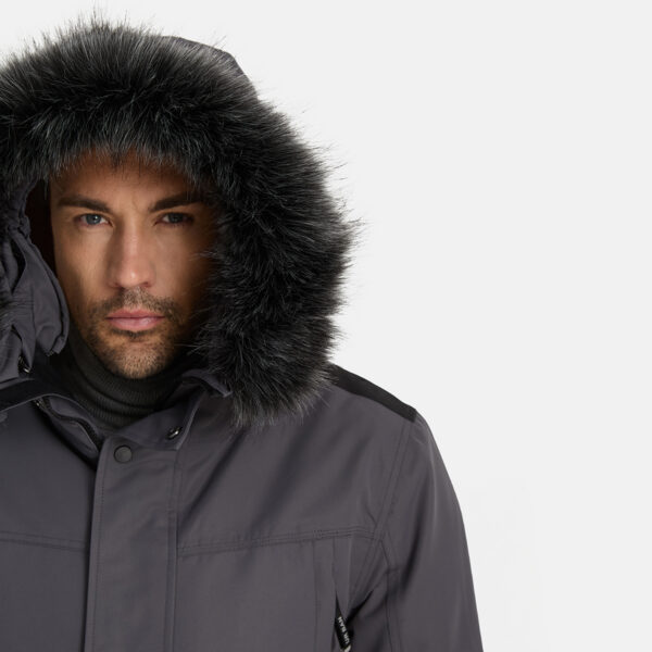 Men´s waterproof and windproof winter coat. Breathable outer fabric. Soft inner fabric. Faux sheepskin lining on the upper back and inside the hood. Adjustable hood. Ribbed cuffs at the sleeve ends. Adjustable sleeve ends. Two-way zipper covered with a press stud at the front. Front pockets with zippers covered by a flap with a magnetic closure. Elastic cord tunnel with stoppers at the waist. Waterproof taped seams. Removable faux fur trim on the hood. Reflective details on the outer fabric.