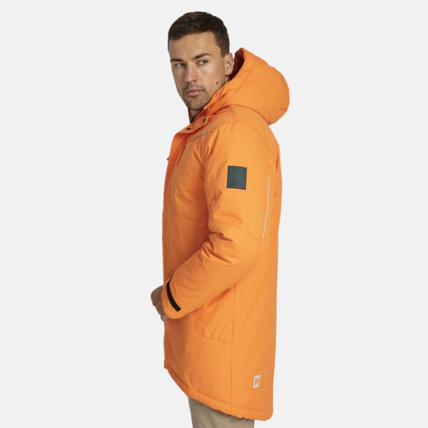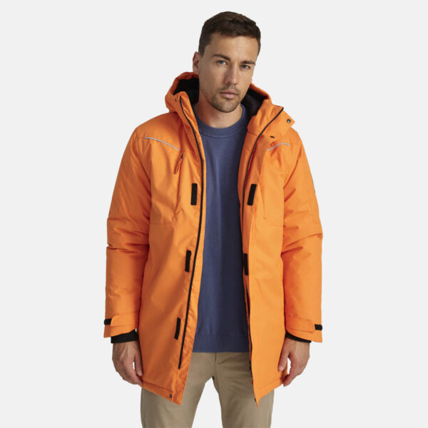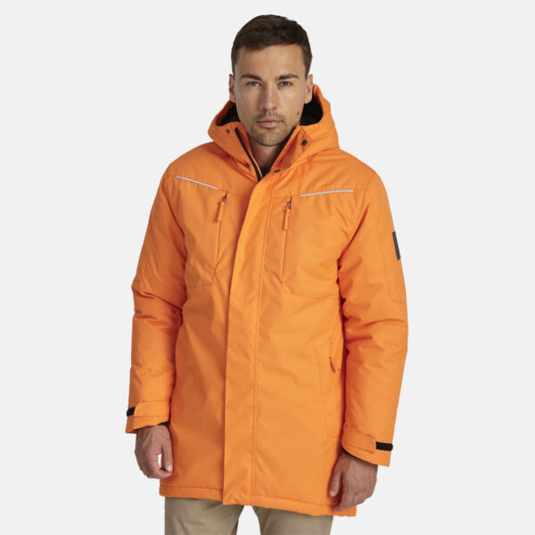 Men’s water- and windproof winter parka with 300 g insulation. Breathable outer fabric. Soft lining fabric inside the parka. Adjustable hood and sleeve cuffs. Ribbed cuffs on sleeves. Waterproof taped seams. Reflective detailing on outer fabric.