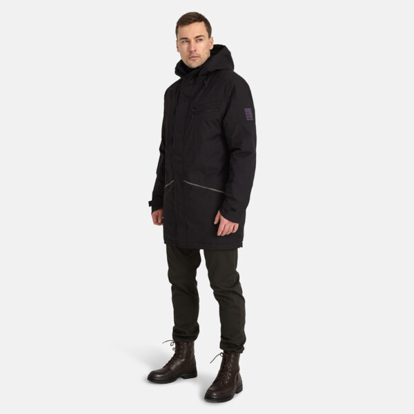 Vīriešu ūdens un vēja necaurlaidīga sezonas pārejas jaka. Gaisu caurlaidīgs virsējais audums. Mīksta mēteļa odere. Regulējama kapuce un piedurknes. Rievotas piedurknes. Ūdensnecaurlaidīgas aizdarāmas krūšu kabatas. Ūdensnecaurlaidīgi līmēti izšuvumi. Auduma virspusē atstarojošas detaļas.