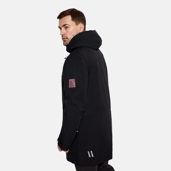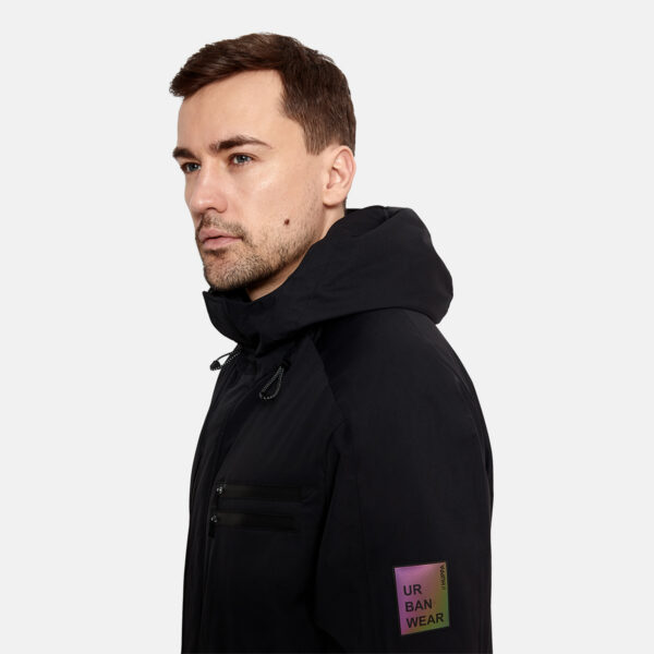 Men’s waterproof and windproof spring and autumn parka Breathable fabric Soft lining on the inside Adjustable hood and sleeve ends Ribbed cuffs at sleeve ends Integrated breast pockets with waterproof zippers Waterproof taped seams Reflective elements on fabric