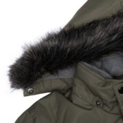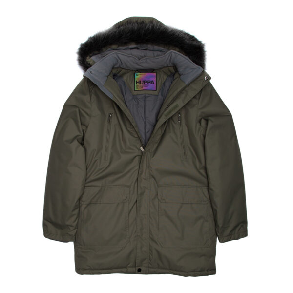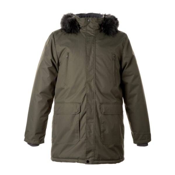 Men’s water- and windproof winter parka with 300 g insulation. Breathable outer fabric. Detachable hood fastens to the collar with snap buttons. Ribbed cuffs on sleeves. Waterproof taped seams. Reflective details on the outer fabric.