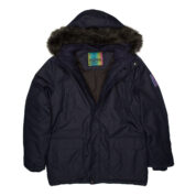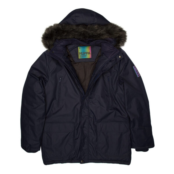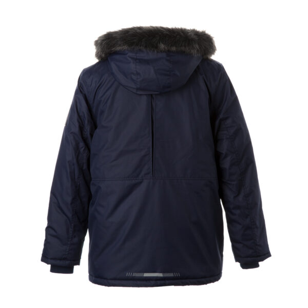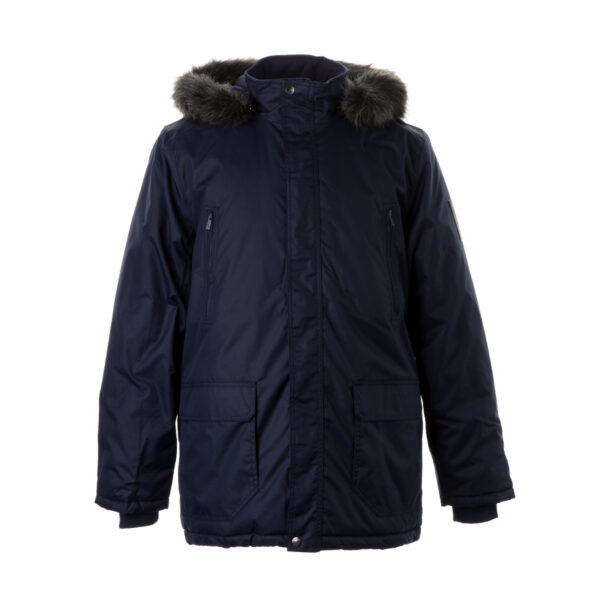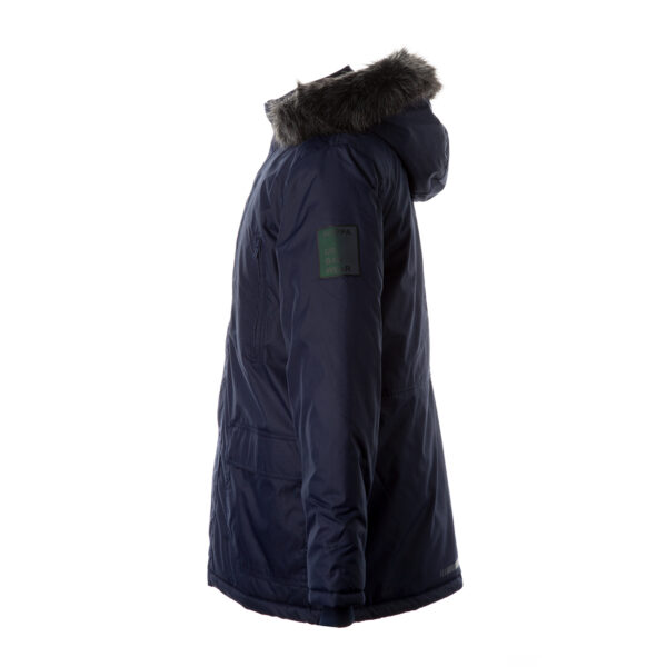 Men’s waterproof and windproof winter parka Breathable fabric Soft lining on the inside Removable snap-on hood Ribbed cuffs at sleeve ends Faux fur trim on hood Waterproof taped seams Reflective elements on fabric