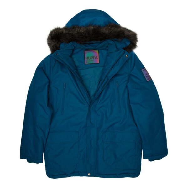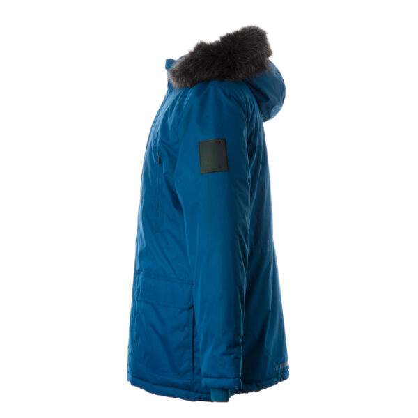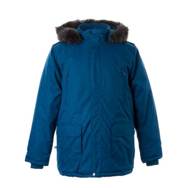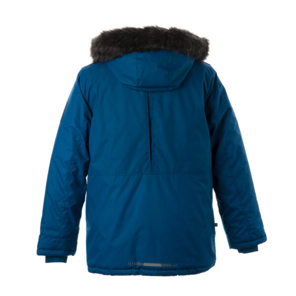 Men’s waterproof and windproof winter parka Breathable fabric Soft lining on the inside Removable snap-on hood Ribbed cuffs at sleeve ends Faux fur trim on hood Waterproof taped seams Reflective elements on fabric