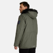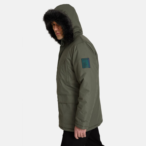 Men’s waterproof and windproof winter parka Breathable fabric Soft lining on the inside Removable snap-on hood Ribbed cuffs at sleeve ends Faux fur trim on hood Waterproof taped seams Reflective elements on fabric
