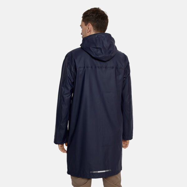 Men’s windproof raincoat. Drawstring on the hood. Waterproof taped seams keep the coat dry. Reflective elements on fabric.