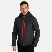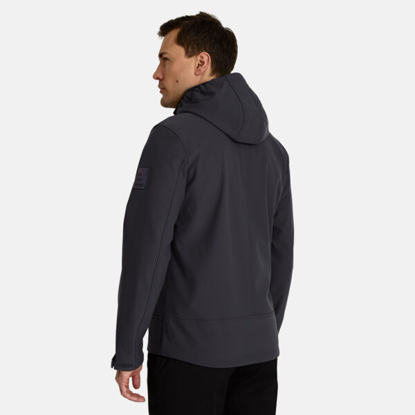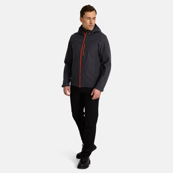 Men’s windproof Softshell jacket. Brushed soft on the inside. Integrated elastic band around the hood. Removable snap-on hood. Adjustable sleeve ends. Integrated zippered pockets. Adjustable drawstring tunnel at bottom. Reflective elements.