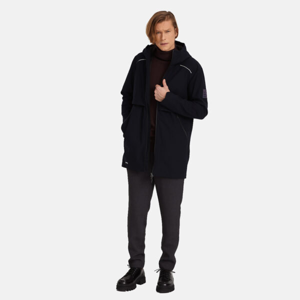 Men´s windproof Softshell parka. The inner lining of the parka is made of a soft brushed material. It has an adjustable waist and hood with stoppers and is decorated with reflective details.
