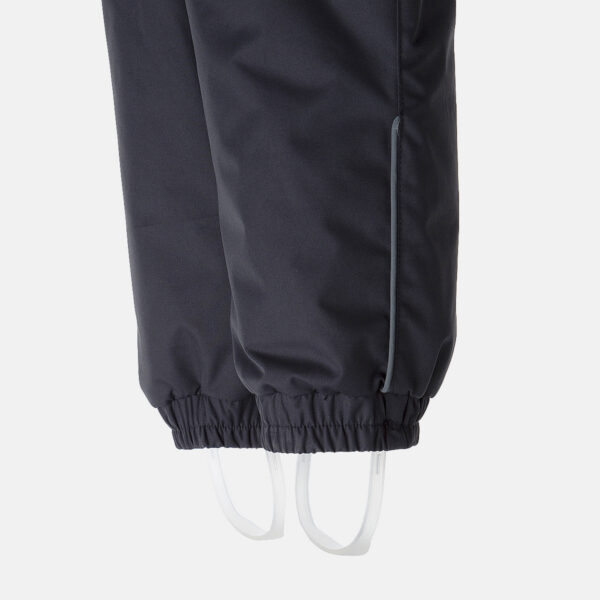 Children’s waterproof and windproof winter pants with 160 g of insulation. Breathable fabric. Soft flannel lining. The bib pants have elastic adjustable braces Integrated elastic band on waist and at leg ends. Taped centre-back seam. The long zipper and elastic bottom edge make it easier to dress the toddler. Elastic foot straps. Reflective elements on fabric.