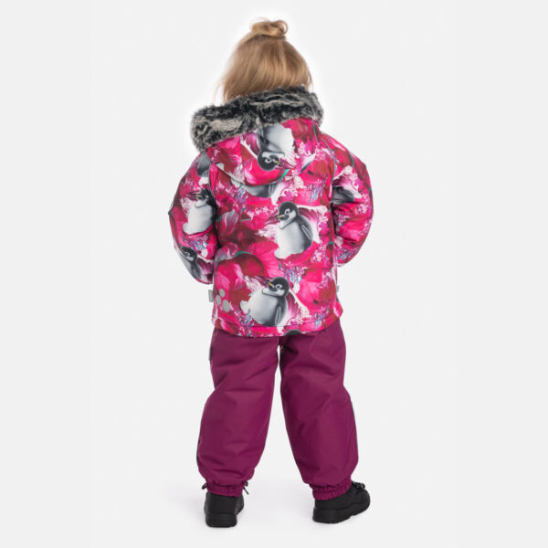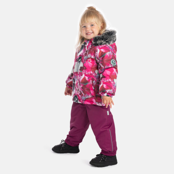 Children’s waterproof and windproof jacket. Breathable fabric. Soft mesh lining on the inside. Removable snap-on hood. Integrated elastic band at sleeve ends. Zipper covered with stud-press flap at front. Integrated pockets at front. Faux fur trim on hood. Reflective elements on fabric.