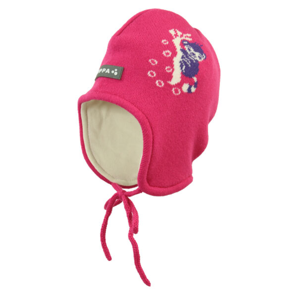 Children’s soft yarn knit hat with 40g of insulation. Cotton jersey on the inside. Reflective Huppa logo