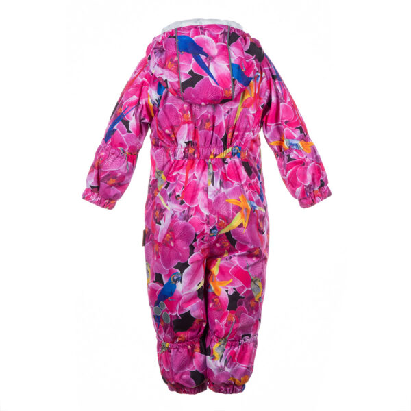 Children´s waterproof and windproof spring-autumn overalls. Breathable outer fabric. The inside of the overalls is made of flannel lining fabric. Rubber band incorporated at the ends of the sleeves and legs and at the edge of the hood. The removable hood attaches to the collar with press studs. Comfortably reversible sleeve and leg ends. Rubber band incorporated in the waste on the back. Waterproof taped seams. The overalls have no inseam on the leg. Removable rubber soles. Reflective details on the outer fabric.