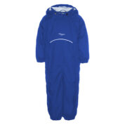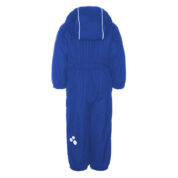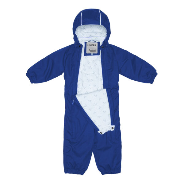 Children´s waterproof and windproof spring-autumn overalls. Breathable outer fabric. The inside of the overalls is made of flannel lining fabric. Rubber band incorporated at the ends of the sleeves and legs and at the edge of the hood. The removable hood attaches to the collar with press studs. Comfortably reversible sleeve and leg ends. Rubber band incorporated in the waste on the back. Waterproof taped seams. The overalls have no inseam on the leg. Removable rubber soles. Reflective details on the outer fabric.