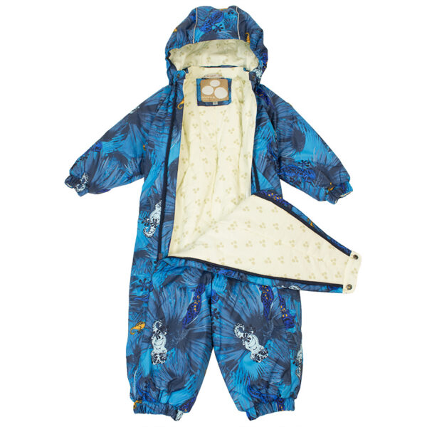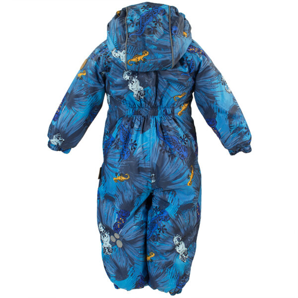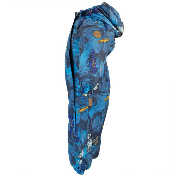 Children´s waterproof and windproof spring-autumn overalls. Breathable outer fabric. The inside of the overalls is made of flannel lining fabric. Rubber band incorporated at the ends of the sleeves and legs and at the edge of the hood. The removable hood attaches to the collar with press studs. Comfortably reversible sleeve and leg ends. Rubber band incorporated in the waste on the back. Waterproof taped seams. The overalls have no inseam on the leg. Removable rubber soles. Reflective details on the outer fabric.