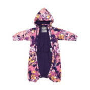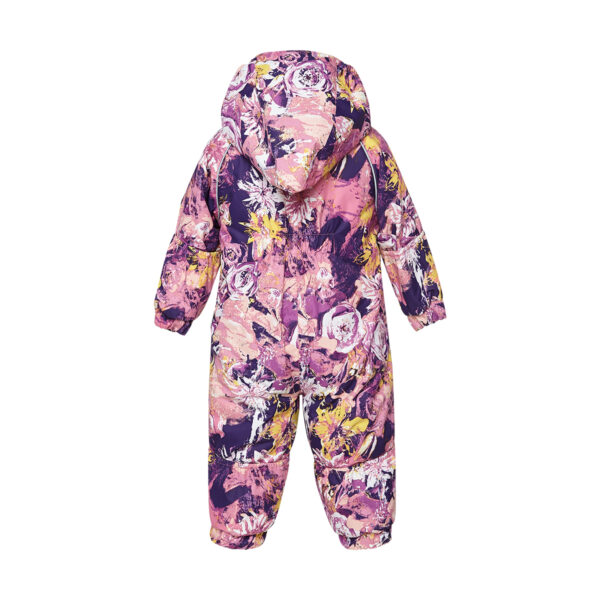 The overall is suitable both for babies or for toddlers who can already walk. The overall has windproof and waterproof top fabric, nice and soft cotton flannel lining inside, and 200 g of insulation. Breathable fabric. Integrated elastic band at sleeve and leg ends and around hood. Elastic foot straps. Sleeve and leg ends can be conveniently rolled down in sizes 68–80. The long zippers make it easy to dress the child, the seams on the bottom and sides are taped and leg ends are covered with the top fabric from the inside to ensure the child stays dry. Reflective elements have been added so that the child is visible in the dark. The removable hood is safe for paying outside – it is secured by press-studs to avoid getting stuck.