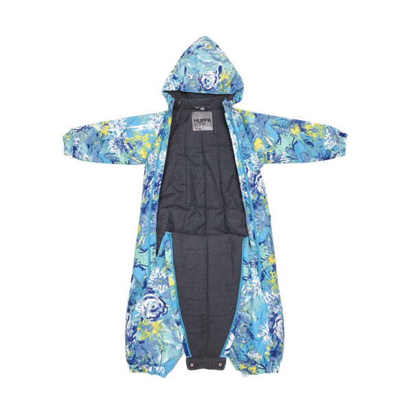 The overall is suitable both for babies or for toddlers who can already walk. The overall has windproof and waterproof top fabric, nice and soft cotton flannel lining inside, and 200 g of insulation. Breathable fabric. Integrated elastic band at sleeve and leg ends and around hood. Elastic foot straps. Sleeve and leg ends can be conveniently rolled down in sizes 68–80. The long zippers make it easy to dress the child, the seams on the bottom and sides are taped and leg ends are covered with the top fabric from the inside to ensure the child stays dry. Reflective elements have been added so that the child is visible in the dark. The removable hood is safe for paying outside – it is secured by press-studs to avoid getting stuck.