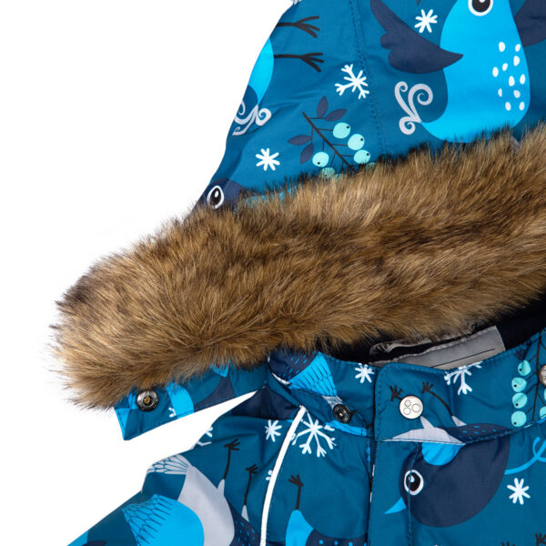 Children’s waterproof and windproof overall. Breathable fabric. Suitable for both babies or for toddlers who can already walk. Nice and soft flannel lining on the inside. Integrated elastic band at sleeve and leg ends. Removable hood attaches to the collar with press-studs to ensure safety when the wearer gets stuck. Sleeve and leg ends can be conveniently rolled down in sizes 68–80. Waterproof taped seams. The overall has no inner leg seam. Elastic foot straps. Removable faux fur trim on hood. Reflective elements on the fabric add safety when wearing in the dark.