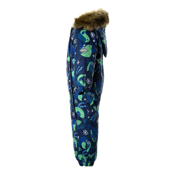 Children’s waterproof and windproof overall. Breathable fabric. Suitable for both babies or for toddlers who can already walk. Nice and soft flannel lining on the inside. Integrated elastic band at sleeve and leg ends. Removable hood attaches to the collar with press-studs to ensure safety when the wearer gets stuck. Sleeve and leg ends can be conveniently rolled down in sizes 68–80. Waterproof taped seams. The overall has no inner leg seam. Elastic foot straps. Removable faux fur trim on hood. Reflective elements on the fabric add safety when wearing in the dark.