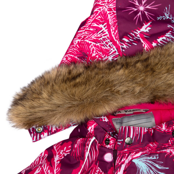 Children’s waterproof and windproof overall. Breathable fabric. Suitable for both babies or for toddlers who can already walk. Nice and soft flannel lining on the inside. Integrated elastic band at sleeve and leg ends. Removable hood attaches to the collar with press-studs to ensure safety when the wearer gets stuck. Sleeve and leg ends can be conveniently rolled down in sizes 68–80. Waterproof taped seams. The overall has no inner leg seam. Elastic foot straps. Removable faux fur trim on hood. Reflective elements on the fabric add safety when wearing in the dark.