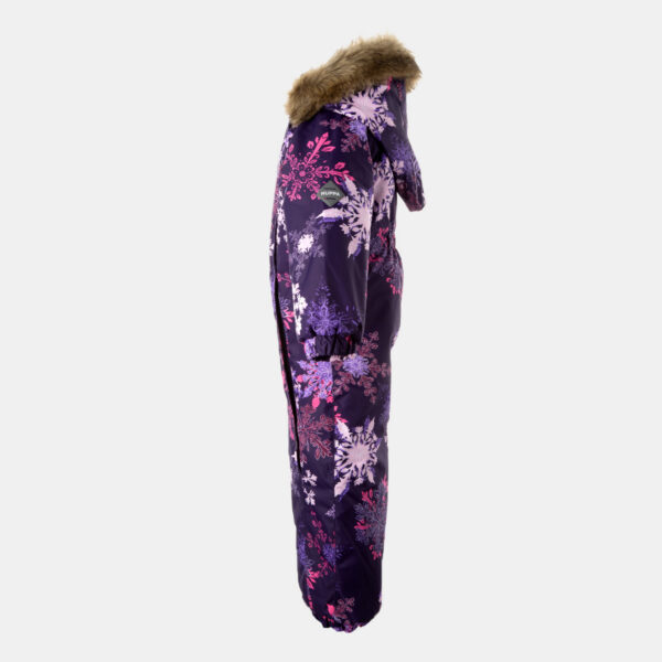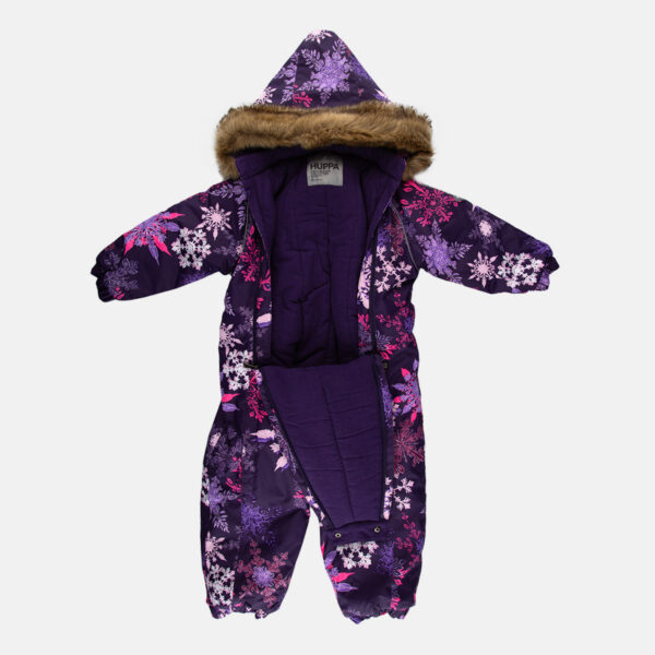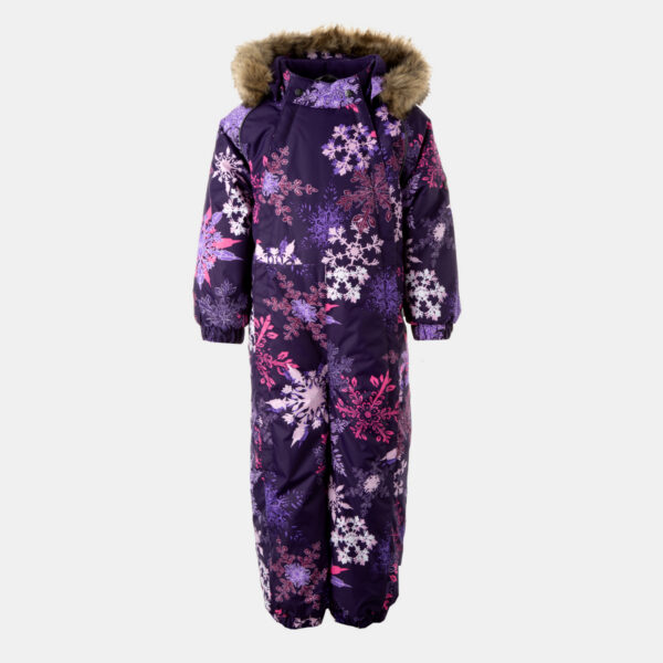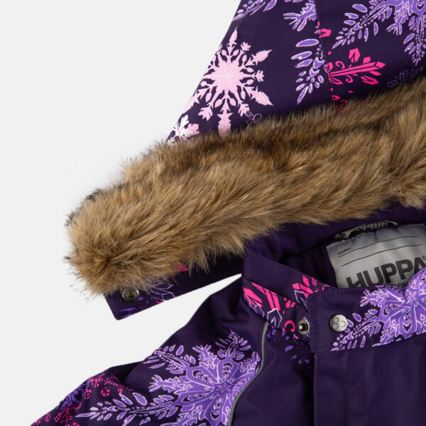 Children’s waterproof and windproof overall. Breathable fabric. Suitable for both babies or for toddlers who can already walk. Nice and soft flannel lining on the inside. Integrated elastic band at sleeve and leg ends. Removable hood attaches to the collar with press-studs to ensure safety when the wearer gets stuck. Sleeve and leg ends can be conveniently rolled down in sizes 68–80. Waterproof taped seams. The overall has no inner leg seam. Elastic foot straps. Removable faux fur trim on hood. Reflective elements on the fabric add safety when wearing in the dark.