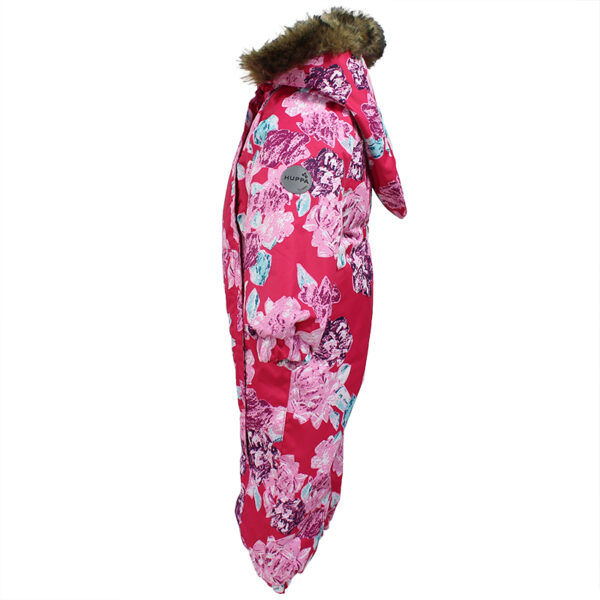 Children’s waterproof and windproof overall. Breathable fabric. Suitable for both babies or for toddlers who can already walk. Nice and soft flannel lining on the inside. Integrated elastic band at sleeve and leg ends. Removable hood attaches to the collar with press-studs to ensure safety when the wearer gets stuck. Sleeve and leg ends can be conveniently rolled down in sizes 68–80. Waterproof taped seams. The overall has no inner leg seam. Elastic foot straps. Removable faux fur trim on hood. Reflective elements on the fabric add safety when wearing in the dark.