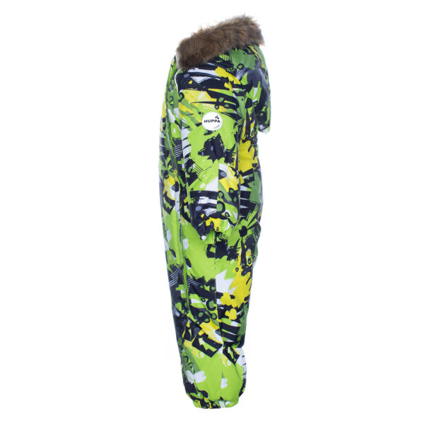 Children’s waterproof and windproof overall. Breathable fabric. Suitable for both babies or for toddlers who can already walk. Nice and soft flannel lining on the inside. Integrated elastic band at sleeve and leg ends. Removable hood attaches to the collar with press-studs to ensure safety when the wearer gets stuck. Sleeve and leg ends can be conveniently rolled down in sizes 68–80. Waterproof taped seams. The overall has no inner leg seam. Elastic foot straps. Removable faux fur trim on hood. Reflective elements on the fabric add safety when wearing in the dark.