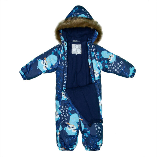 Children’s waterproof and windproof overall. Breathable fabric. Suitable for both babies or for toddlers who can already walk. Nice and soft flannel lining on the inside. Integrated elastic band at sleeve and leg ends. Removable hood attaches to the collar with press-studs to ensure safety when the wearer gets stuck. Sleeve and leg ends can be conveniently rolled down in sizes 68–80. Waterproof taped seams. The overall has no inner leg seam. Elastic foot straps. Removable faux fur trim on hood. Reflective elements on the fabric add safety when wearing in the dark.