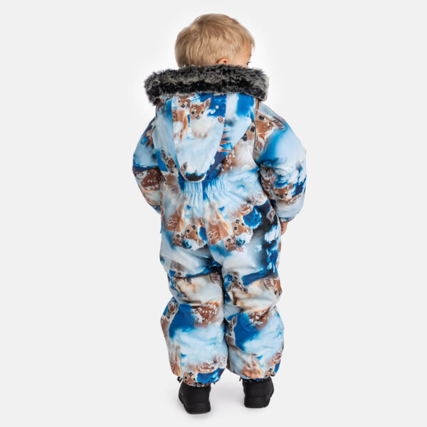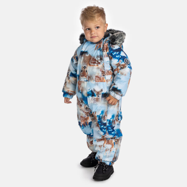 Children’s waterproof and windproof overall. Breathable fabric. Suitable for both babies or for toddlers who can already walk. Nice and soft flannel lining on the inside. Integrated elastic band at sleeve and leg ends. Removable hood attaches to the collar with press-studs to ensure safety when the wearer gets stuck. Sleeve and leg ends can be conveniently rolled down in sizes 68–80. Waterproof taped seams. The overall has no inner leg seam. Elastic foot straps. Removable faux fur trim on hood. Reflective elements on the fabric add safety when wearing in the dark.