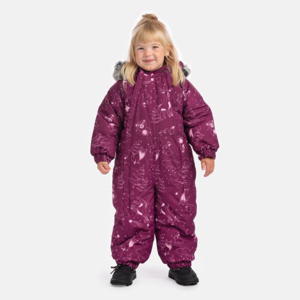 Children’s waterproof and windproof overall. Breathable fabric. Suitable for both babies or for toddlers who can already walk. Nice and soft flannel lining on the inside. Integrated elastic band at sleeve and leg ends. Removable hood attaches to the collar with press-studs to ensure safety when the wearer gets stuck. Sleeve and leg ends can be conveniently rolled down in sizes 68–80. Waterproof taped seams. The overall has no inner leg seam. Elastic foot straps. Removable faux fur trim on hood. Reflective elements on the fabric add safety when wearing in the dark.