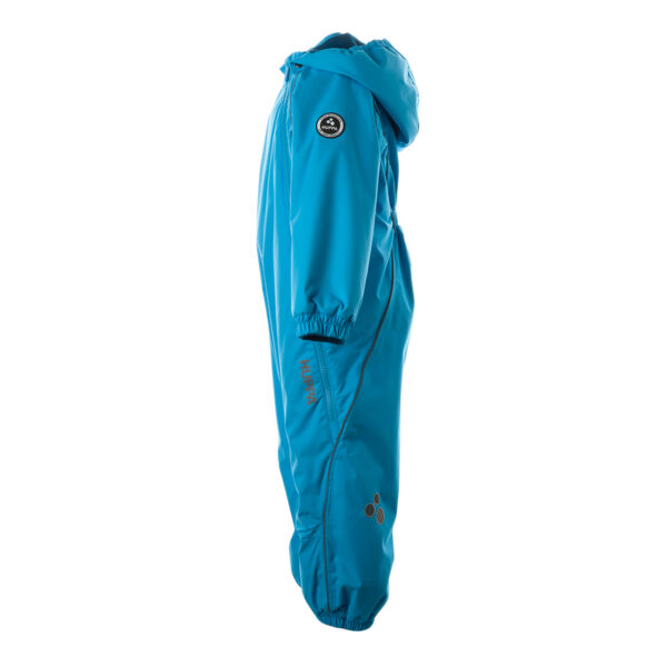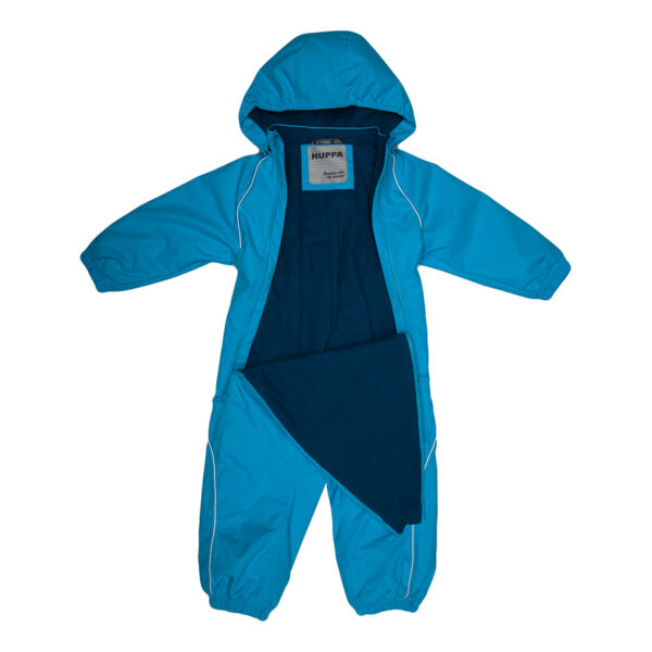 Babies’ waterproof and windproof between-seasons overall Breathable fabric Flannel lining on the inside Integrated elastic band at sleeve and leg ends and around hood Removable snap-on hood Sleeve and leg ends can be conveniently rolled down in sizes 68–80 Waterproof taped seams The product comes with both silicone and rubber foot straps Reflective elements on fabric