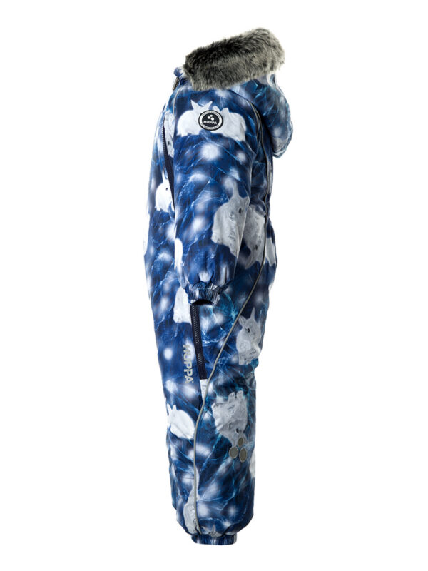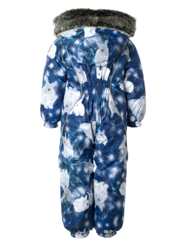 Babies’ modern waterproof and windproof winter overall. Breathable fabric. Flannel lining on the inside. Integrated elastic band at sleeve and leg ends and at waist on the back. The removable snap-on hood is safe for when the child gets stuck when playing outside. Sleeve and leg ends can be conveniently rolled down in sizes 68–80. Waterproof taped seams. The product comes with both silicone and rubber foot straps. Faux fur trim on hood. The high-performance top fabric is great to wear for children in any winter weather. The insides of leg ends are also covered with the main fabric to keep the child dry. Numerous reflective elements on the top fabric ensure visibility from all sides in the dark winter time.