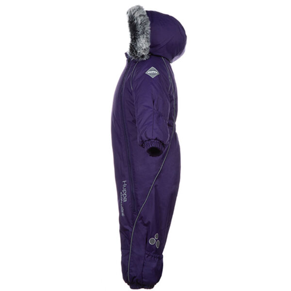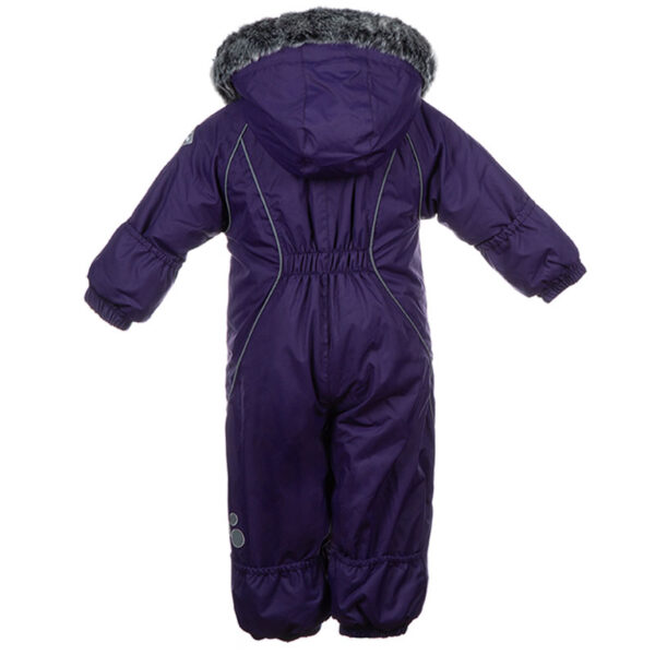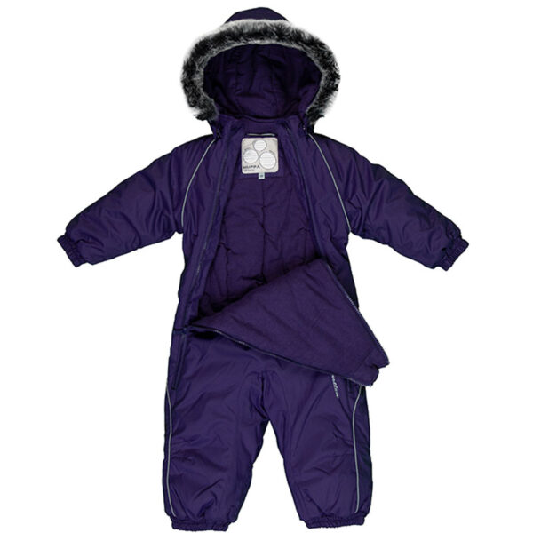Babies’ modern waterproof and windproof winter overall. Breathable fabric. Flannel lining on the inside. Integrated elastic band at sleeve and leg ends and at waist on the back. The removable snap-on hood is safe for when the child gets stuck when playing outside. Sleeve and leg ends can be conveniently rolled down in sizes 68–80. Waterproof taped seams. The product comes with both silicone and rubber foot straps. Faux fur trim on hood. The high-performance top fabric is great to wear for children in any winter weather. The insides of leg ends are also covered with the main fabric to keep the child dry. Numerous reflective elements on the top fabric ensure visibility from all sides in the dark winter time.