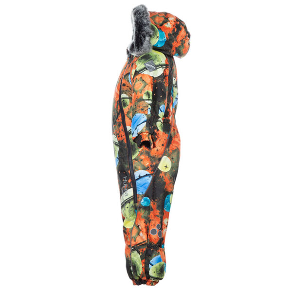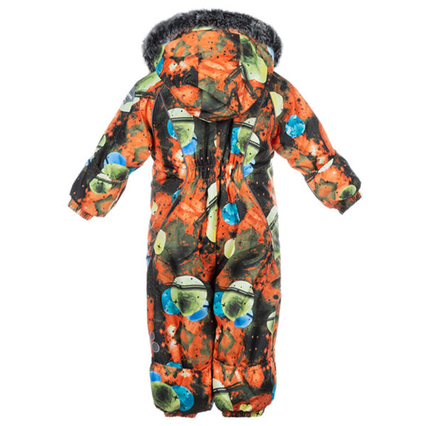Babies’ modern waterproof and windproof winter overall. Breathable fabric. Flannel lining on the inside. Integrated elastic band at sleeve and leg ends and at waist on the back. The removable snap-on hood is safe for when the child gets stuck when playing outside. Sleeve and leg ends can be conveniently rolled down in sizes 68–80. Waterproof taped seams. The product comes with both silicone and rubber foot straps. Faux fur trim on hood. The high-performance top fabric is great to wear for children in any winter weather. The insides of leg ends are also covered with the main fabric to keep the child dry. Numerous reflective elements on the top fabric ensure visibility from all sides in the dark winter time.