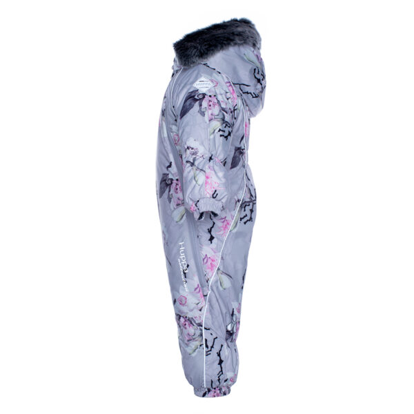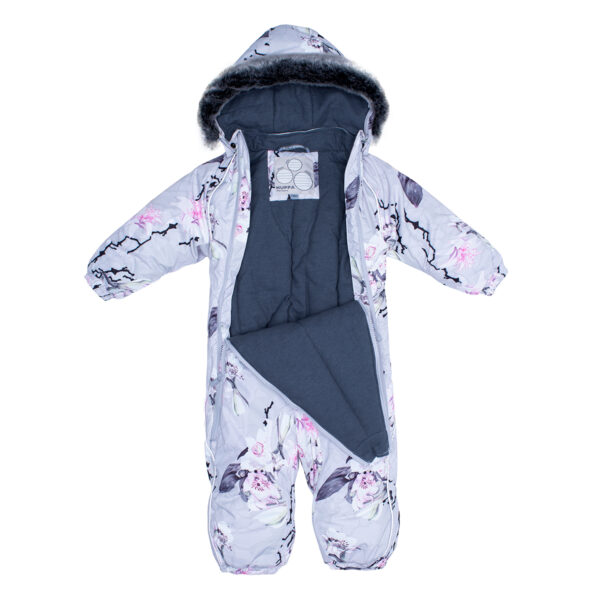 Babies’ modern waterproof and windproof winter overall. Breathable fabric. Flannel lining on the inside. Integrated elastic band at sleeve and leg ends and at waist on the back. The removable snap-on hood is safe for when the child gets stuck when playing outside. Sleeve and leg ends can be conveniently rolled down in sizes 68–80. Waterproof taped seams. The product comes with both silicone and rubber foot straps. Faux fur trim on hood. The high-performance top fabric is great to wear for children in any winter weather. The insides of leg ends are also covered with the main fabric to keep the child dry. Numerous reflective elements on the top fabric ensure visibility from all sides in the dark winter time.