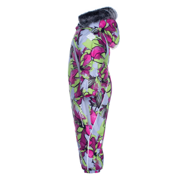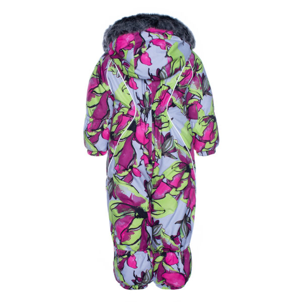Babies’ modern waterproof and windproof winter overall. Breathable fabric. Flannel lining on the inside. Integrated elastic band at sleeve and leg ends and at waist on the back. The removable snap-on hood is safe for when the child gets stuck when playing outside. Sleeve and leg ends can be conveniently rolled down in sizes 68–80. Waterproof taped seams. The product comes with both silicone and rubber foot straps. Faux fur trim on hood. The high-performance top fabric is great to wear for children in any winter weather. The insides of leg ends are also covered with the main fabric to keep the child dry. Numerous reflective elements on the top fabric ensure visibility from all sides in the dark winter time.
