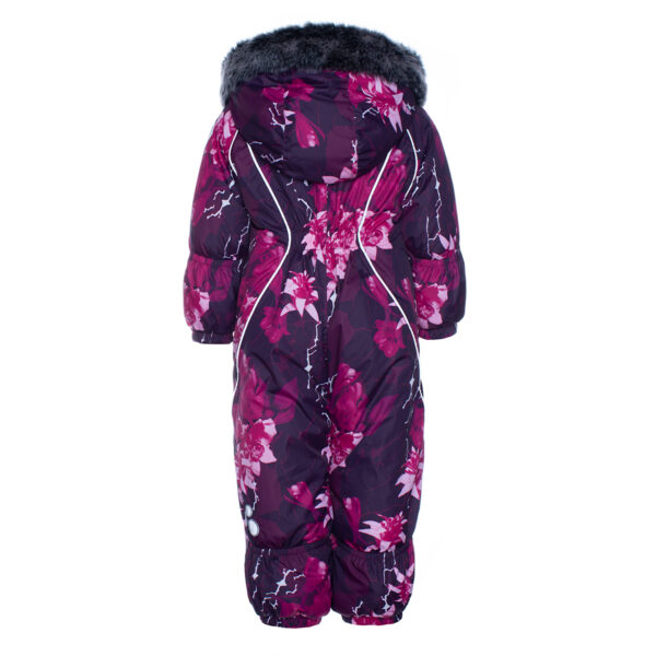 Babies’ modern waterproof and windproof winter overall. Breathable fabric. Flannel lining on the inside. Integrated elastic band at sleeve and leg ends and at waist on the back. The removable snap-on hood is safe for when the child gets stuck when playing outside. Sleeve and leg ends can be conveniently rolled down in sizes 68–80. Waterproof taped seams. The product comes with both silicone and rubber foot straps. Faux fur trim on hood. The high-performance top fabric is great to wear for children in any winter weather. The insides of leg ends are also covered with the main fabric to keep the child dry. Numerous reflective elements on the top fabric ensure visibility from all sides in the dark winter time.