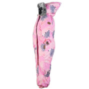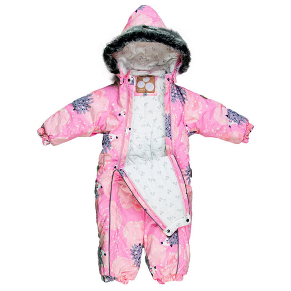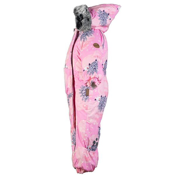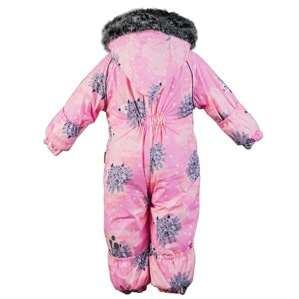 Babies’ waterproof and windproof winter overall. Breathable fabric. Flannel lining on the inside. Integrated elastic band at sleeve and leg ends and at waist on the back. Removable snap-on hood. Sleeve and leg ends can be conveniently rolled down in sizes 68–80. Waterproof taped seams. The overall has no inner leg seam. The product comes with both silicone and rubber foot straps. Faux fur trim on hood. Reflective elements on fabric.