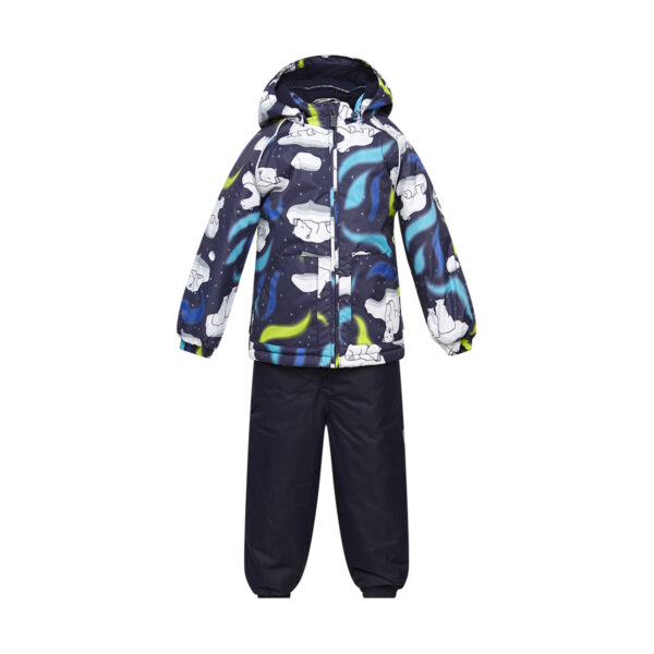 Klasisks divdaļīgs komplekts ar vatelīna pildījumu mazuļiem. Mīksta kokvilnas flaneļa odere, gaisa caurlaidīgs un ūdeni atgrūdošs virsējais audums. Bikses ar paaugstinātu vidukļa daļu un nolīmētu sēžas šuvi. Noņemama kapuce ar kažokādas apmali, regulējamas gumijas lences un ir divas kabatas.