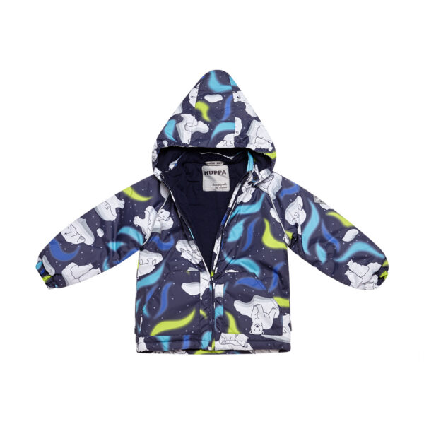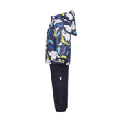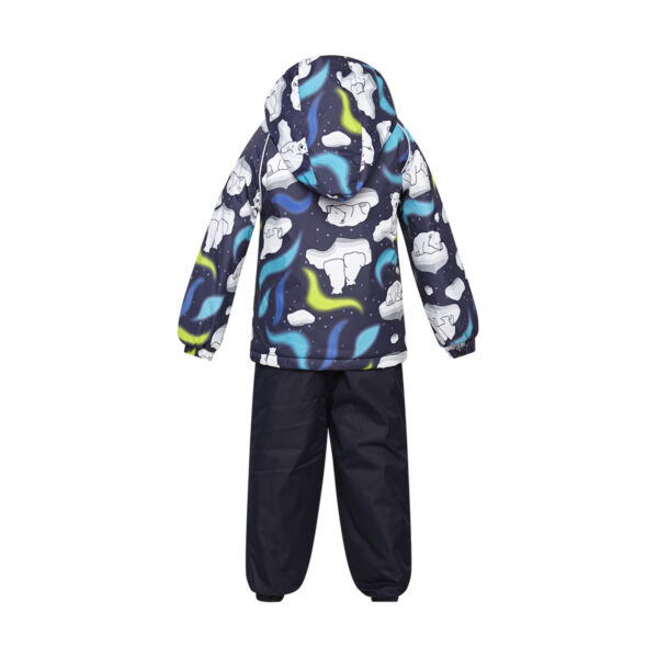 Klasisks divdaļīgs komplekts ar vatelīna pildījumu mazuļiem. Mīksta kokvilnas flaneļa odere, gaisa caurlaidīgs un ūdeni atgrūdošs virsējais audums. Bikses ar paaugstinātu vidukļa daļu un nolīmētu sēžas šuvi. Noņemama kapuce ar kažokādas apmali, regulējamas gumijas lences un ir divas kabatas.
