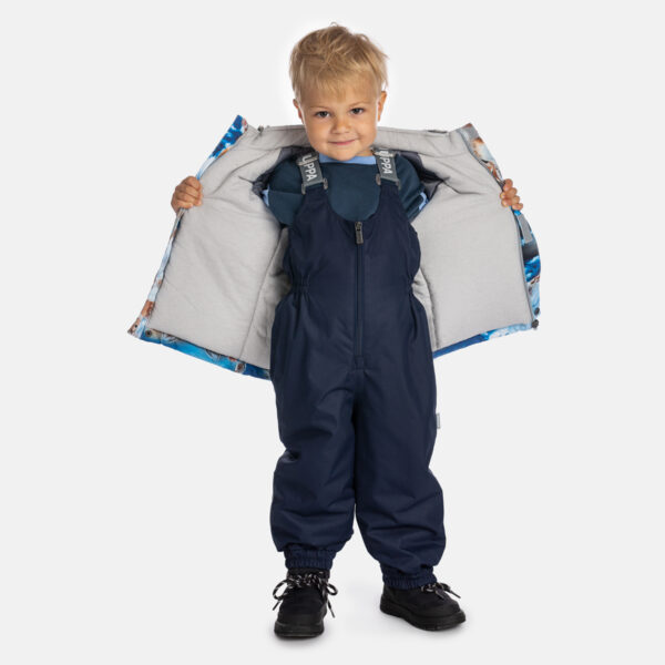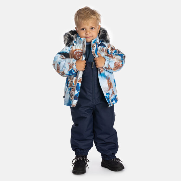 Children’s Winter Jacket & Pants Set. A durable and protective set designed for active winter days. Both the jacket and pants are made with a waterproof, windproof, and breathable outer fabric to keep children dry and comfortable. The soft mesh lining adds extra comfort on the inside. The jacket features an integrated elastic band at the sleeve ends, a removable snap-on hood with faux fur trim, and reflective elements for visibility. The bib pants come with elastic, adjustable braces, an integrated elastic waistband, and fully taped waterproof seams. Together, they offer reliable warmth, comfort, and protection for all winter adventures.