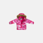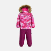 Vaikiškas striukės ir kelnių komplektas. Neperšlampamas ir neperpučiamas, orui laidus viršutinis audinys. Striukės ir kelnių vidinė pusė iš minkšto pamušalinio audinio. Rankovių apačioje įsiūta guminė juostelė. Nuimamas gobtuvas prie apykaklės prisegamas kibiu lipduku. Gobtuvas apsiūtas dirbiniu kailiu. Kelnės aukštesniu liemeniu ir turi reguliuojamas elastines petnešas. Ant juosmens ir klešnių galuose įsiūta guminė juostelė. Vandeniui atsparios klijuotos siūlės. Kelnėse yra elastingos guminės juostelės kelnėms prisegti prie batų. Ant striukės ir kelnių šviesą atspindinčios detalės.