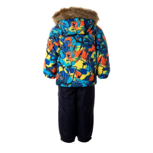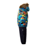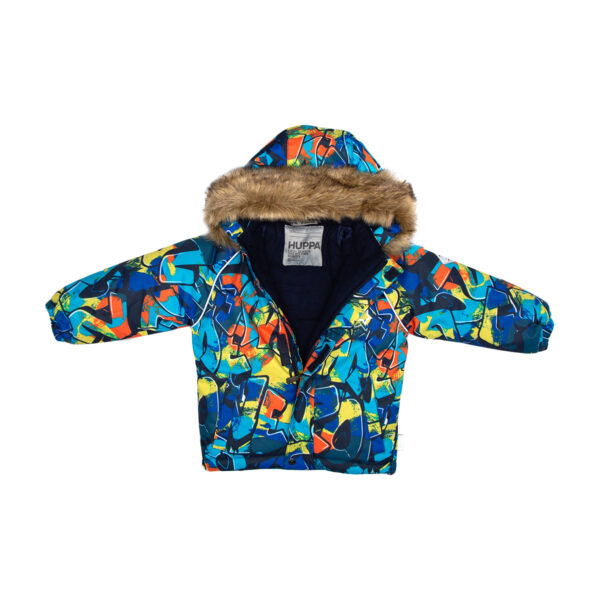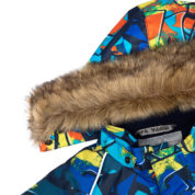 Children’s jacket and pants set. Waterproof and windproof, breathable top fabric. Soft mesh lining on the inside of the jacket and pants. Integrated elastic band at sleeve ends . Removable snap-on hood. Faux fur trim on hood. The bib pants have elastic adjustable braces. Integrated elastic band on waist. Waterproof taped seams. Reflective elements on both jacket and pants.