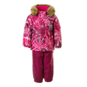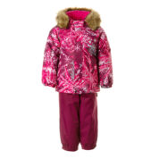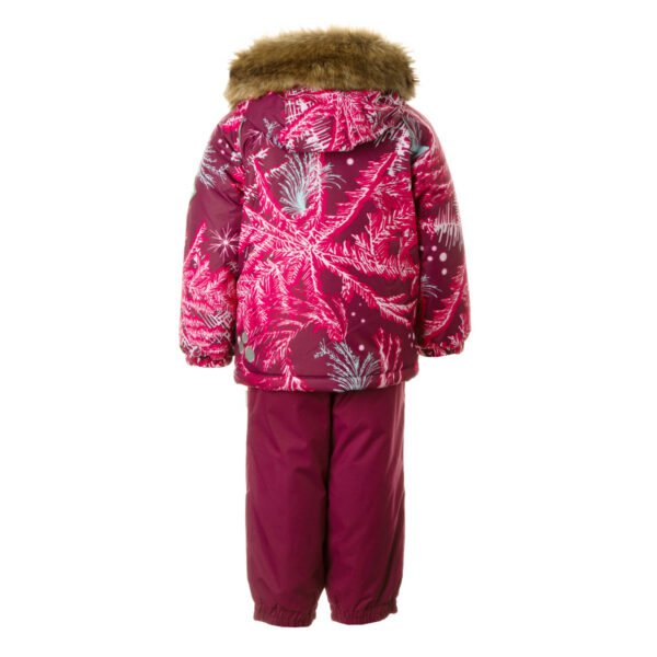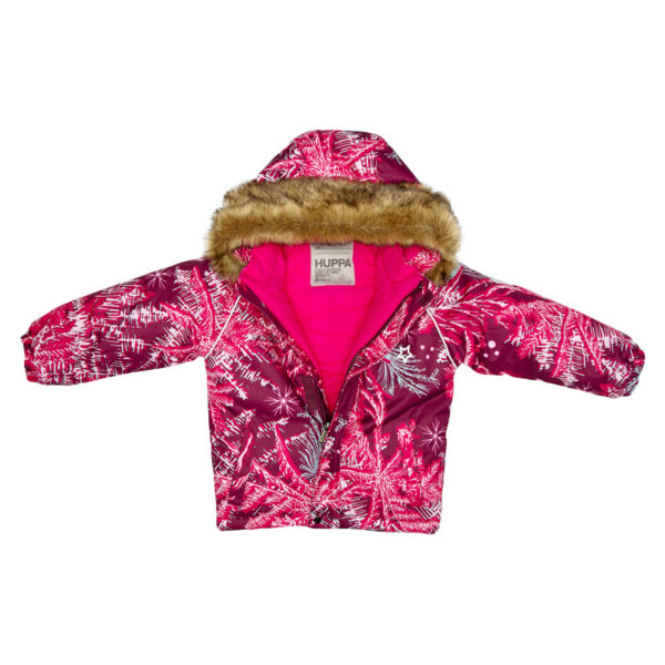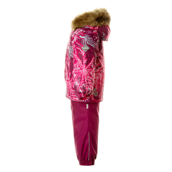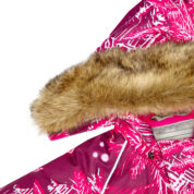 Children’s jacket and pants set. Waterproof and windproof, breathable top fabric. Soft mesh lining on the inside of the jacket and pants. Integrated elastic band at sleeve ends . Removable snap-on hood. Faux fur trim on hood. The bib pants have elastic adjustable braces. Integrated elastic band on waist. Waterproof taped seams. Reflective elements on both jacket and pants.