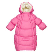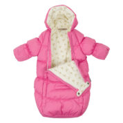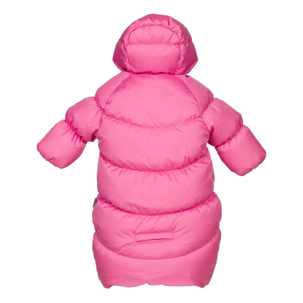 Waterproof and windproof babies’ sleeping bag. The sleeping bag is lined with soft cotton flannel and has breathable top fabric. It is easy to fit the baby into the sleeping bag thanks to the two full-length zippers, and for car rides, seat belts can conveniently be secured through the belt holes. Integrated elastic band at sleeve ends and around hood. The sleeve ends can easily be turned back and there is no need for gloves. Two long zippers at front.
