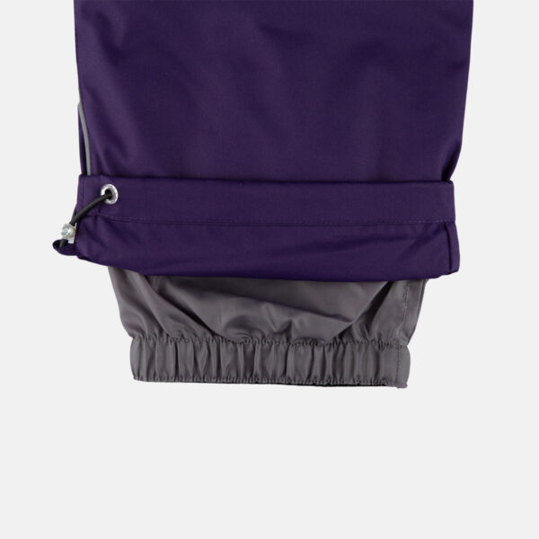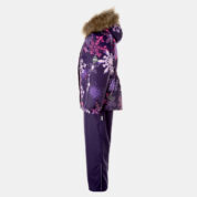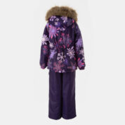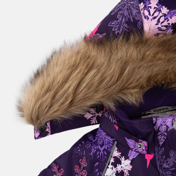 Children’s jacket and pants set. Waterproof and windproof, breathable top fabric. Soft mesh lining on the inside of the jacket and pants. Integrated elastic band at sleeve ends and on the waist. Removable snap-on hood Faux fur trim on hood. The bib pants have elastic adjustable braces. Integrated elastic band on waist. Drawstring tunnel with stoppers at leg ends. Waterproof taped seams. The pants have no inner leg seam. Reflective elements on both jacket and pants.