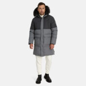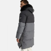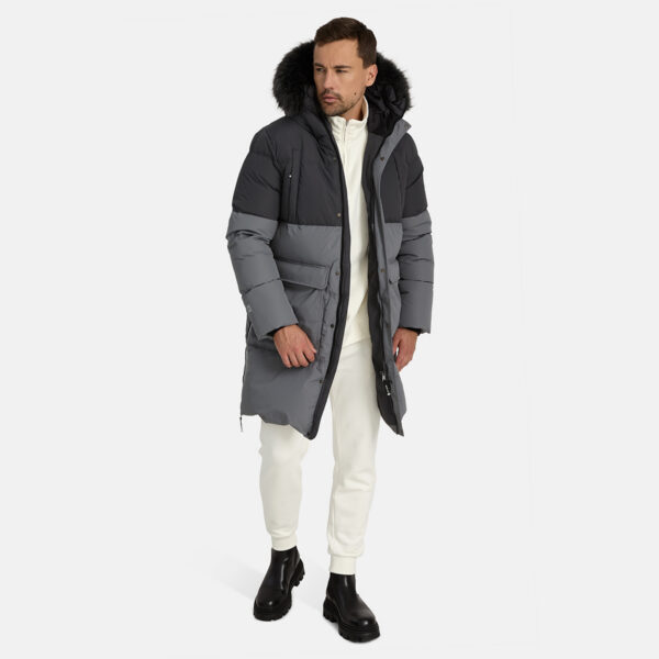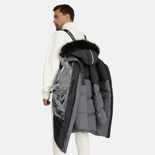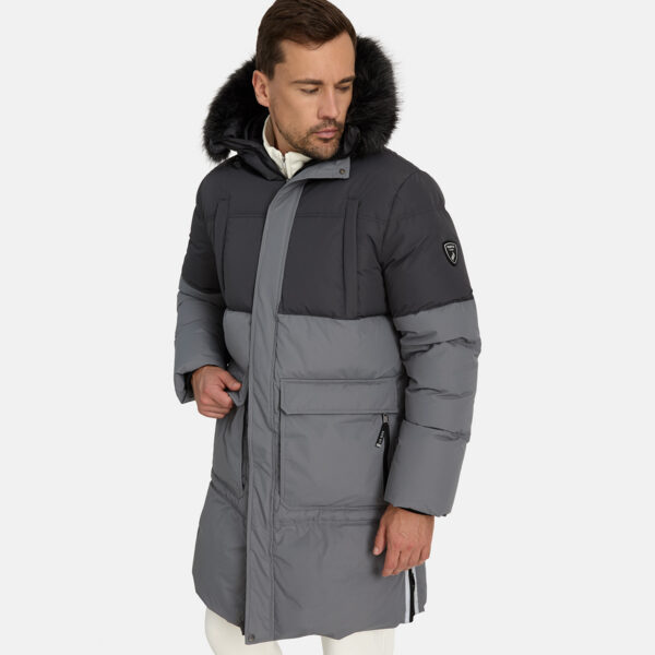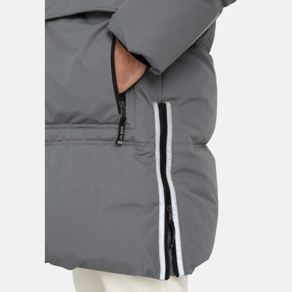 Unisex water- and windproof down coat. The breathable outer fabric is made from recycled fibres. Soft lining fabric inside the coat. Filled with feathers and down feathers. Ribbed cuffs on sleeves. Front two-way zipper with a snap button placket. The coat has removable elastic suspenders. Reflective detailing on outer fabric.