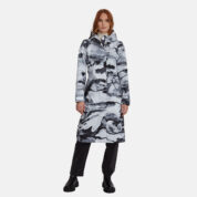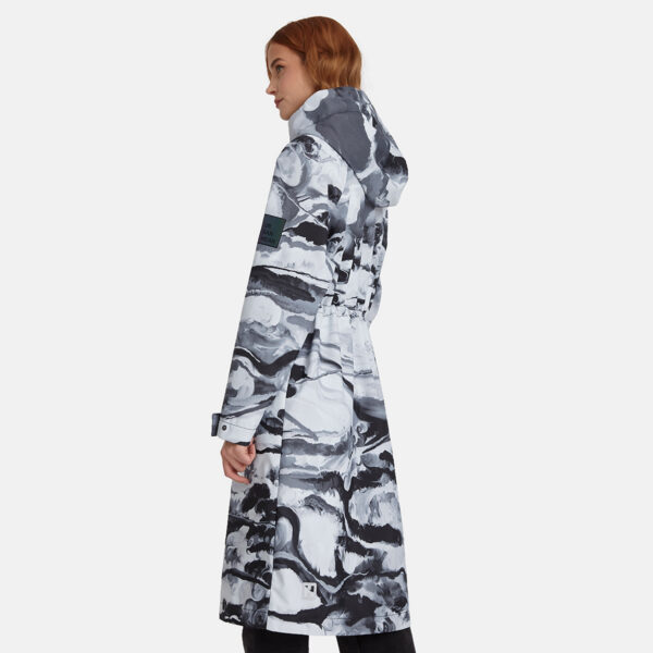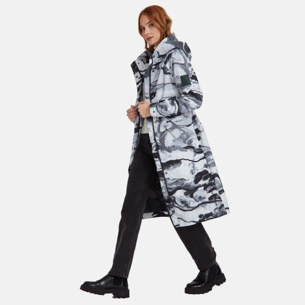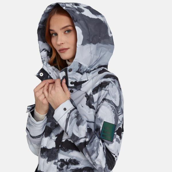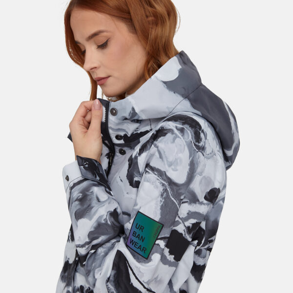 Loose cut water- and windproof ShellProtect coat for women. ShellProtect fabric is an innovative, three-layer material, therefore the product does not have a lining. Adjustable hood and sleeve cuffs. Waterproof taped seams. Rubber cord tunnel with stoppers on the waistband. Front two-way zipper with a snap button placket. Reflective elements on fabric.