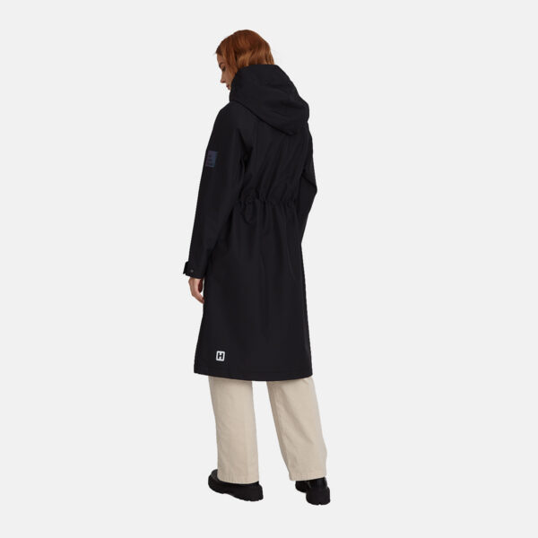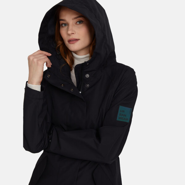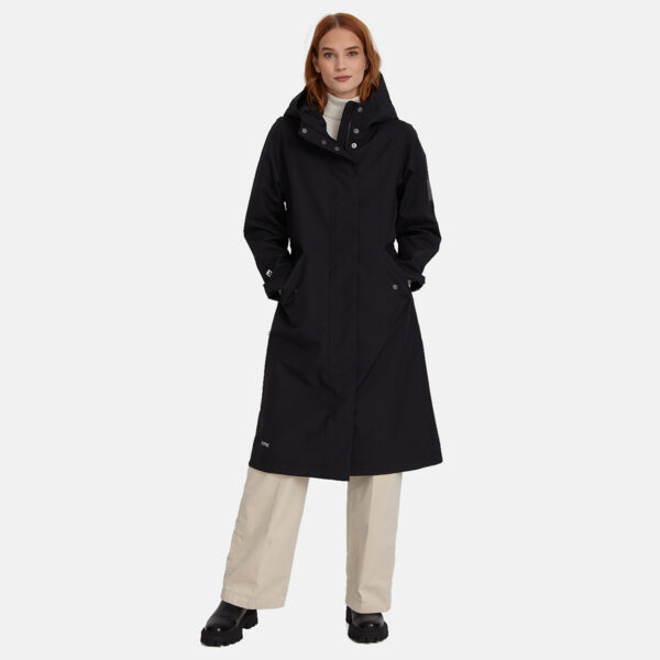 Loose cut water- and windproof ShellProtect coat for women. ShellProtect fabric is an innovative, three-layer material, therefore the product does not have a lining. Adjustable hood and sleeve cuffs. Waterproof taped seams. Rubber cord tunnel with stoppers on the waistband. Front two-way zipper with a snap button placket. Reflective elements on fabric.