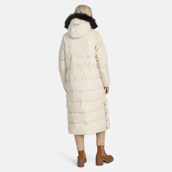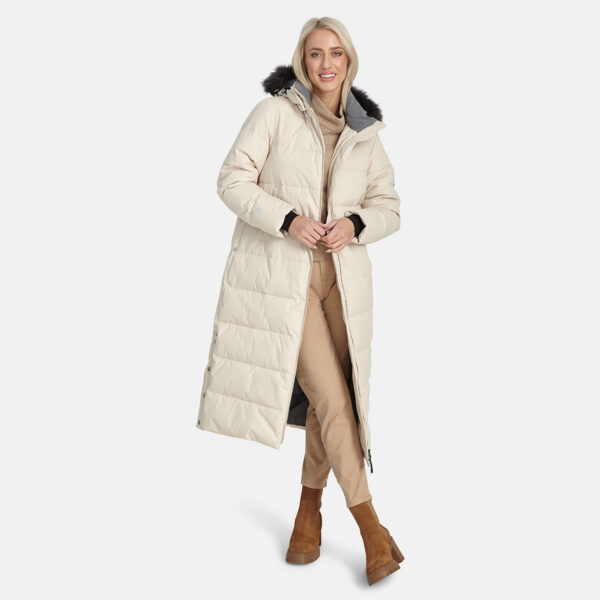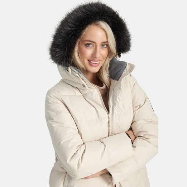 Women’s water- and windproof winter coat with 400 g insulation. Breathable outer fabric. Soft lining fabric inside the coat. Detachable hood fastens to the collar with snap buttons. Ribbed cuffs on sleeves. Rubber cord tunnel with stoppers on the waistline. Front two-way zipper. Detachable faux fur trim on hood. Reflective detailing has been added to the outer fabric of the coat for better visibility in the dark.