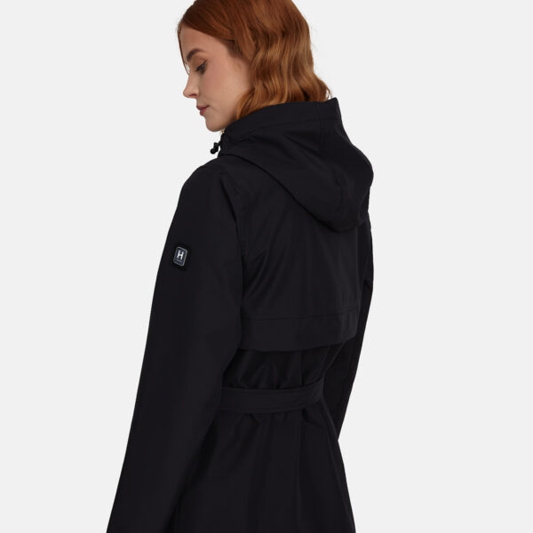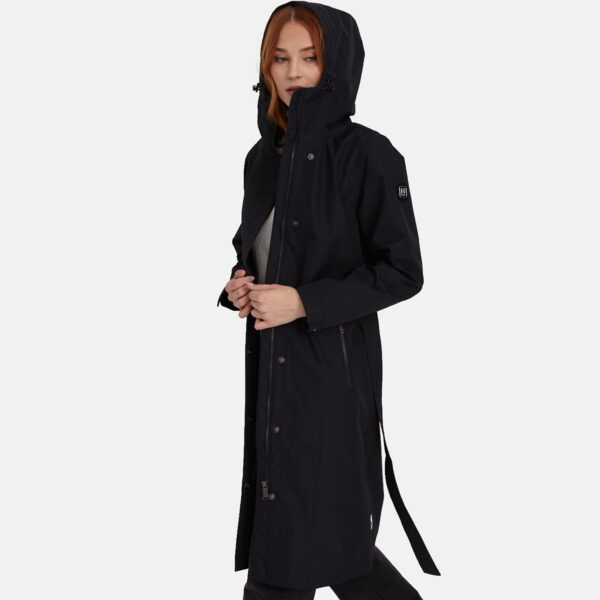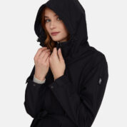Water- and windproof ShellProtect coat for women. ShellProtect fabric is an innovative, three-layer material, therefore the product does not have a lining. Adjustable hood and sleeve cuffs. Waterproof taped seams. Rubber cord tunnel with stoppers on the waistband. Front two-way zipper with a snap button placket. Reflective elements on fabric.
